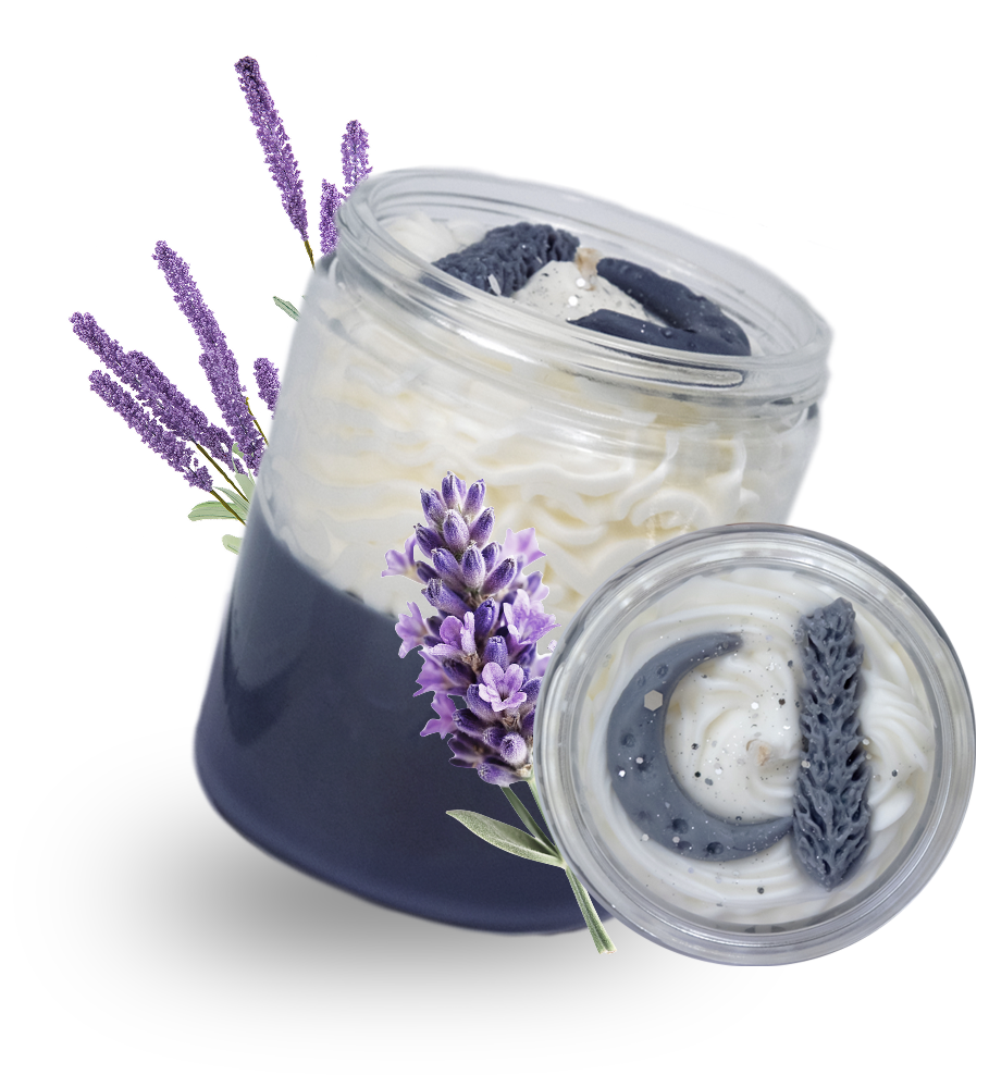 Apportez sérénité et douceur à votre intérieur avec cette bougie artisanale au tourbillon de cire fouettée gris et blanc, ornée de délicates sculptures représentant une branche de lavande et un croissant de lune.
